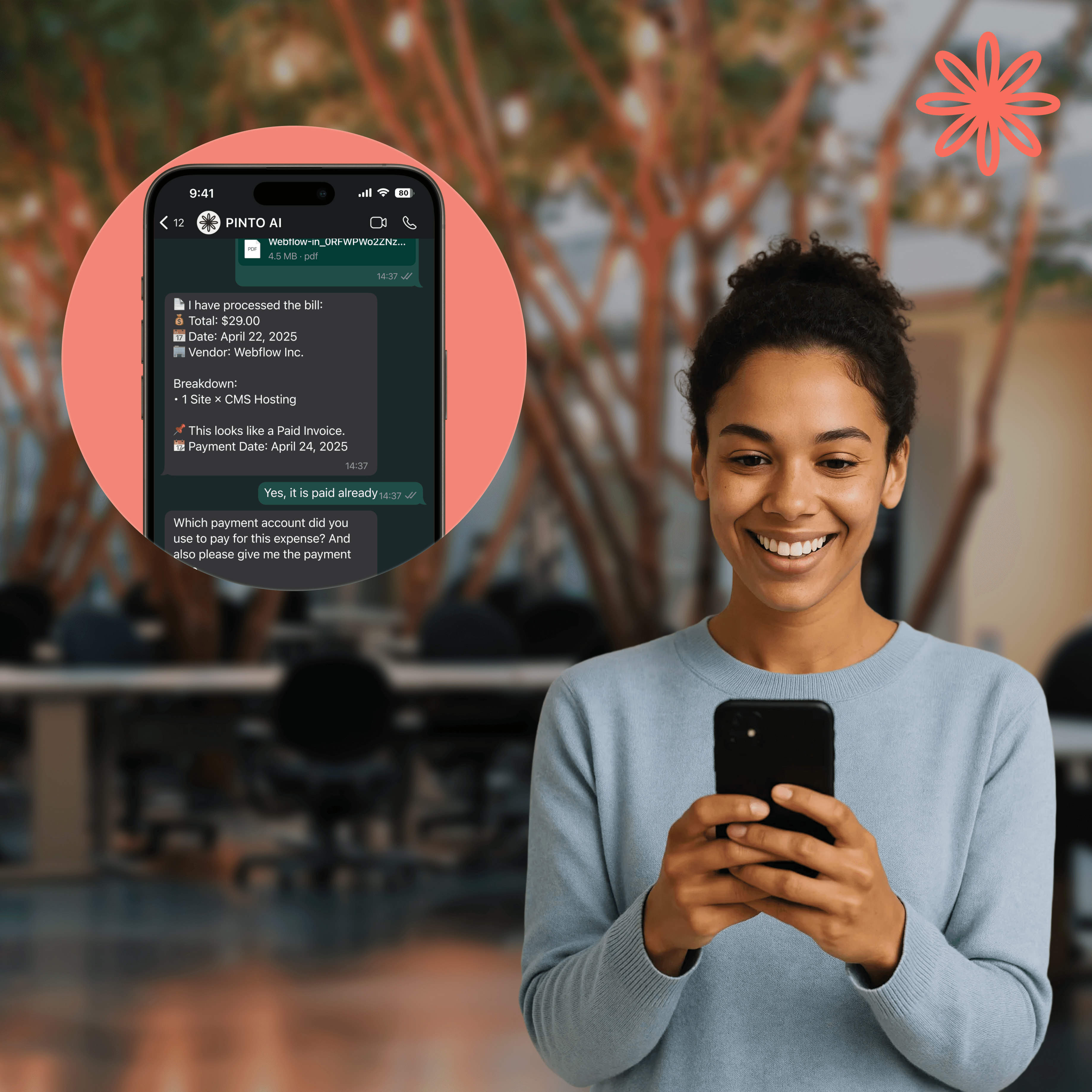 Pinto’s OCR technology extracts and records all details (vendor, date, amount, category) automatically.